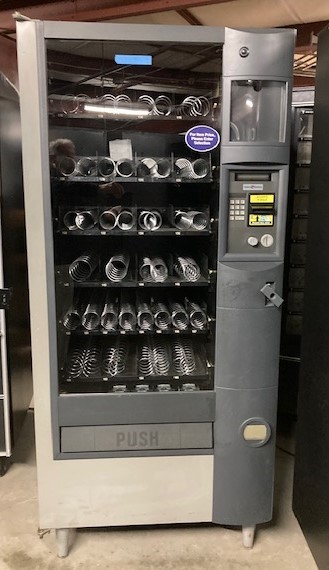 which can be viewed when you click on the Specs and Additional Information link below. The AP-121 at 27 5/8″ deep (Great for narrow door ways & tight spaces) has less capacity than the 35″ deep AP-122,.heights & widths are identical..These machines have been thoroughly cleaned and tested, are in 100% working, equipped with dual spirals for most snack snack selections, and able to support credit card systems as well as 4 & 5 tube coin acceptors.